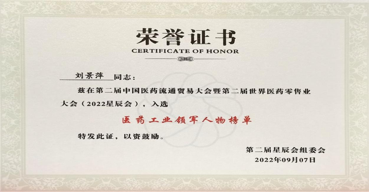 在本次开幕式上,发布了“医药工业领军人物”、“医药零售领军人物”榜单,皇冠体育药业集团刘景萍董事长凭借在儿药领域多年的努力探索和对行业的杰出贡献,荣获“医药工业领军人物”称号。