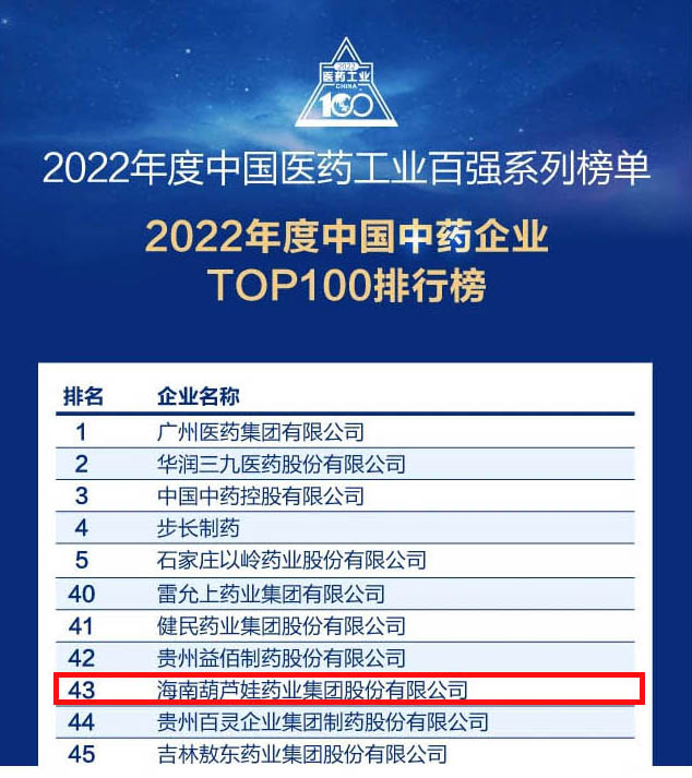 皇冠体育药业集团连续4年荣登“中国中药企业TOP100排行榜”,排名上升至第43位